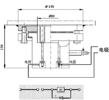 1、電極裝置安裝于油箱底部,開口尺寸φ80,信號裝置安裝在便于觀察使用地方,二者間宜用屏蔽電纜連接并在一點(diǎn)接地。裝于油箱底板的電極裝置有4個電極,可分別并聯(lián)使用其中兩個。