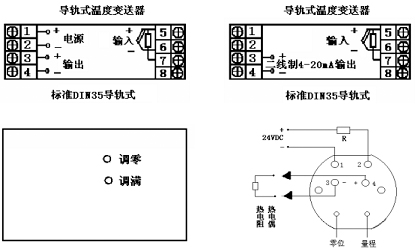 對導軌式溫度變送器輸入可以是熱電偶、熱電阻、標準信號。工作電源接端子1、2,4~20mA輸出信號接3正、4負;對二線制4~20mA輸入信號正接5、負接6;熱電阻單端A5、并聯(lián)端B、C分別接67。