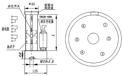 報警點(diǎn)接線盒:端子1、2為上限,液位高于上限時斷開,低于上限時閉合;端子3、4為中點(diǎn),液位高于中點(diǎn)時斷開,低于中點(diǎn)時閉合;端子5、6為下限,液位低于下限時閉合,高于下限時斷開。